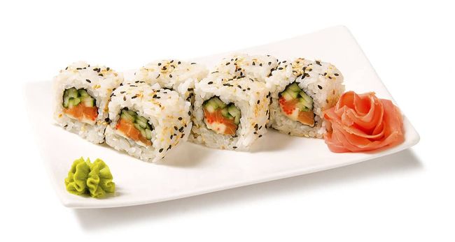 Dentro: salmón, aguacate, pepino Fuera: ajonjolí